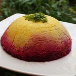 Трем белок на мелкой терке сверху на свеклу, снимаем форму и притрушиваем желтками.