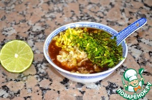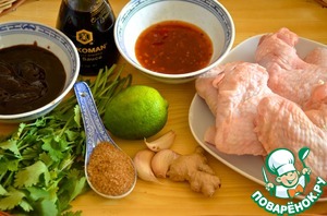 2. Имбирь почистить и мелко нарезать. Черенки кинзы мелко порубить. Чеснок пропустить через пресс. Смешать три соуса с имбирем, кинзой, чесноком, коричневым сахаром и соком лайма.