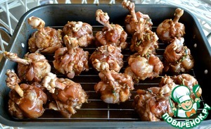5. Разогреть духовку до 200С. Выложить крылышки на противень с решеткой. В противень влить немного воды, так, чтобы она не касалась крылышек. Полить крылышки половиной оставшегося маринада и запекать 20 минут. Полить оставшимся маринадом и запекать еще 20 минут.