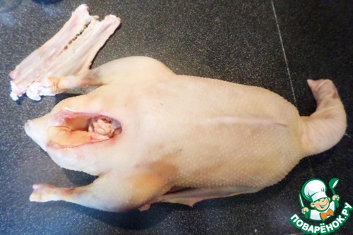 1. Первым делом займемся гусем. В этот раз я заказывала птицу у наших фермеров, и мне досталась очень чистая, идеально обработанная тушка. Но такое бывает редко, поэтому, если у вас не так, вооружитесь щипчиками и доведите шкурку до идеального состояния. Дальше тушке предстоит ещё ряд операций: шею отрубим (смотри пункт 2)и проверим, удален ли пищевод, крылья отрежем до первого сустава, а ножки - до колен. Кстати, если на баранине я предпочитаю оставить весь жир, то с гусиком действует обратный принцип: весь жир, обнаруженный в тушке, мы тщательно извлечем. На нем потом можно будет жарить много чего вкусного.