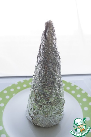 Теперь приступаем к самому сложному этапу: подбиранию размера основы. Из плотной бумаги скручиваем узкий конус и скрепляем его концы степлером. Теперь пробуем обложить его эклерами (это делать лучше вдвоем): в нижние ярусы поместите те пирожные, что покрупнее, в верхние - поменьше. Для верхушки оставляем самый красивый эклерчик. Если пирожных не хватает чтобы обложить весь конус, отрежьте небольшую полоску снизу. Снова повторите эксперимент. Счастливчики угадывают со второго раза, а всем остальным приходится провести еще несколько серий экспериментов. Я обычно использую тот конус, на который почти хватило эклеров. А при складывании елки откладываю 5 пирожных. И вот когда все остальные у меня кончаться, отрезаю лишнюю вершину и выкладываю эклеры поверх среза. Когда с размером определяетесь, то оберните бумажный конус фольгой и приступайте к приготовлению клея.