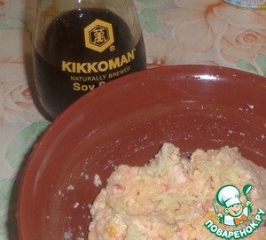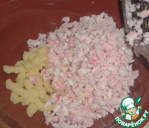 • Измельчить в мясорубке крабовые палочки, картофель и кукурузу.