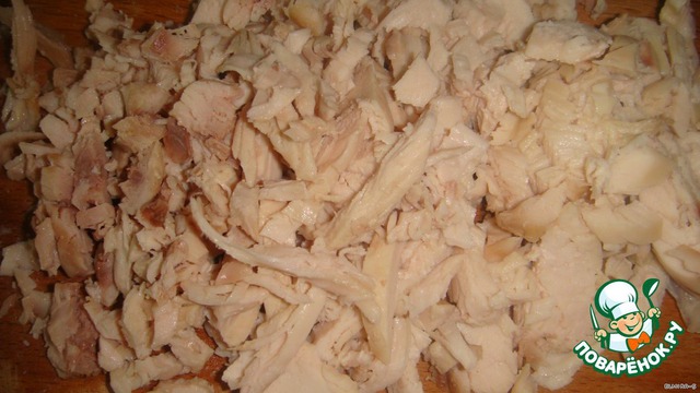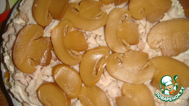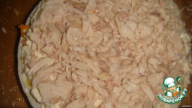 Выложите половину подготовленных ингредиентов слоями,поливая майонезом затем выложите нарезанными ломтиками курицу