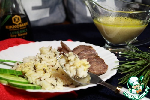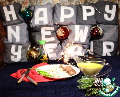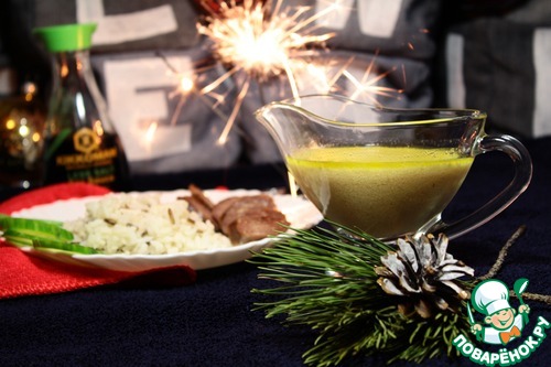 Соус подается к отварному мясу и другим блюдам. Например, прекрасно дополняет рис или картофельное пюре, которое, не знаю как у Вас, а у нас является основным гарниром на праздничном столе.