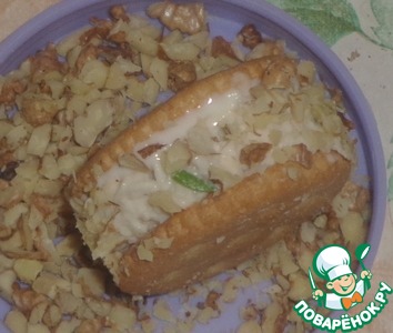 Грецкие орехи измельчить. Обжарить немного на сухой сковороде, остудить. Обсыпать начинку грецкими орехами.