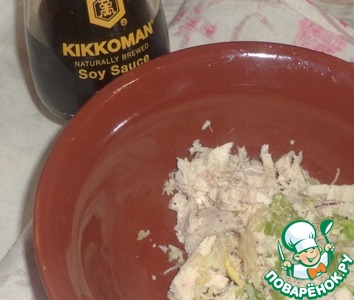 Чеснок натереть на мелкой терке. Кубиками нарезать куриную грудку. Добавить соевый соус и зеленый лук.