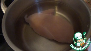 1. Варим куриное филе (за 15 минут до готовности необходимо посолить и поперчить по вкусу). Варим яйцо и морковь.