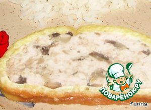 Пока запекался сыр, я нарезала довольно мелко шампиньоны и лук и поджарила их на сковородке до полного испарения жидкости, потом еще ложку сметаны туда и немного потушила. Начинку остудила. Вообще-то можно и без грибов обойтись или заменить их на то, что у вас есть под рукой: оливки, каперсы, сладкий перец.