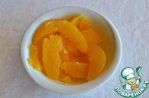 4. С апельсинов снять кожуру и белую пленку и разделить на сегменты.