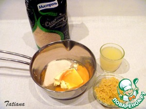 В небольшую кастрюльку насыпьте сахар, добавьте мягкое масло, яйцо + 2 ст. л. лимонного сока.
