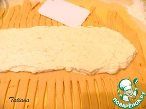 Тесто раскатайте в прямоугольник ~ 30*40 см., с двух краёв (как на фото) сделайте надрезы, в середину поместите половину творожно-лимонной начинки. Заверните наверх поочередно надрезанные полоски,"косой". -