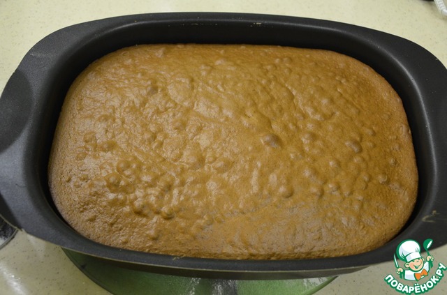 Остывший корж разрезать вдоль на 2 коржа.