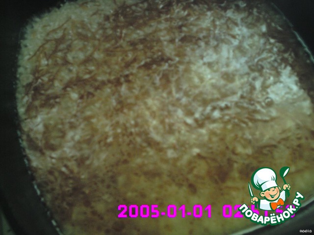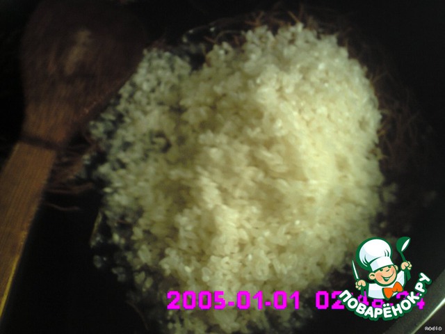 Заливаем горячим бульоном или водой, рис лишь слегка прикрыт.
