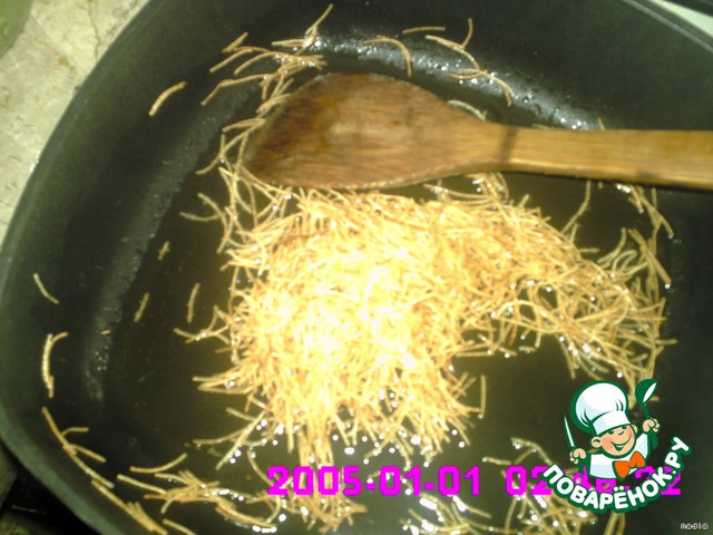 Наливаем масло в кастрюлю и разогреваем, всыпаем вермешель и обжариваем до золотистого или розового цвета.