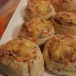 5. Раскатываем второй пласт и делаем из него кружочки-донышки. Соединяем кружочки и кусочки рулета. Посыпаем сверху сыром.