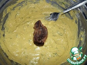 Замесить тесто или кляр, так как должно получиться нечто среднее. В теплой воде хорошо размешать майонез, добавить дрожжи, обе муки, карри, свежемолотый перец, соль. Хорошо перемешать. Регулируйте количество муки, она разная, может понадобиться меньше или больше, кляр должен получиться очень густой. Красный жгучий перец добавляем по желанию, для любителей остренького (я готовила в этот раз и для детей, поэтому не добавляла)