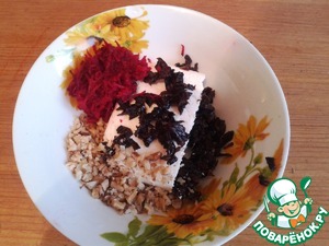 Долго не решалась поделиться рецептом, так как у меня не весь процесс запечатлён, потому что всегда готовлю второпях.) Но здесь нет ничего сложного: сырую свёклу трём на мелкой тёрке, сухофрукты (чернослив, курага) и орехи мелко шинкуем.