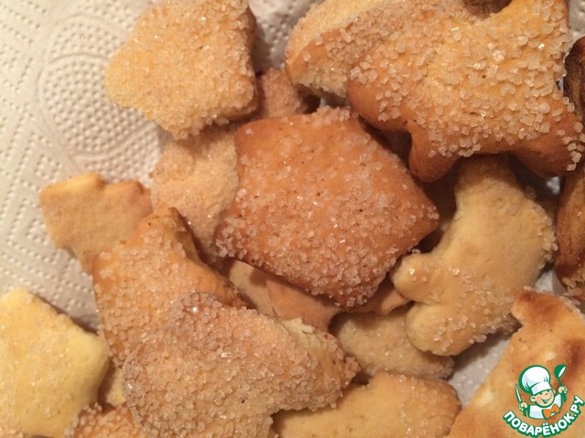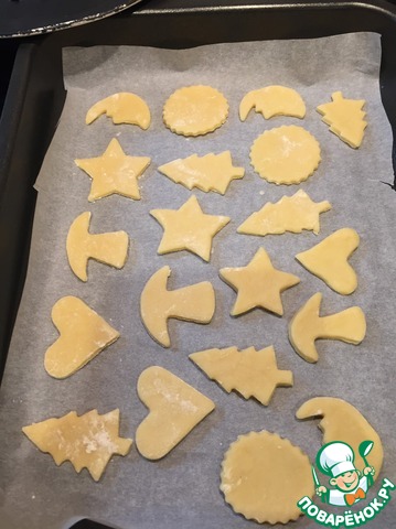 Раскатываем тесто толщиной 5 мм, присыпая поверхность хорошо мукой. Вырезаем печеньки разными формочками. Выпекаем при 180 градусах 8-10 минут. Потом остужаем на решётке.