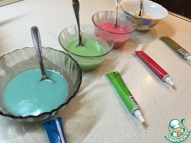 Делаем глазурь, добавляя в сахарную пудру 6 столовых ложек воды (смотрите по консистенции! она должна быть в меру густая и в меру жидкая!) Разделяем по тарелочкам и добавляем в каждую краситель пищевой.