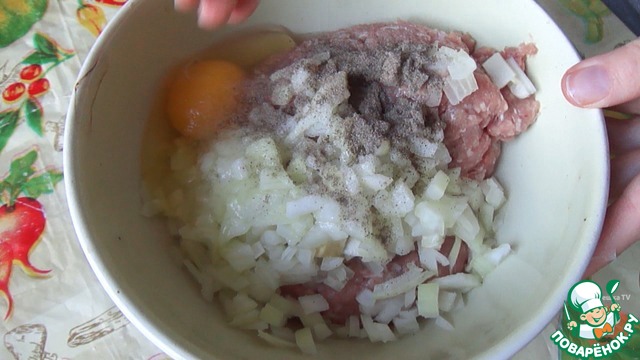1. Смешиваем фарш с нарезанным луком. Вбиваем яйцо. Солим и перчим по вкусу. Перемешиваем.
