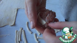 4. Из фарша формируем среднего размера шарики и обматываем их полосками из теста, как бы делая клубочки.