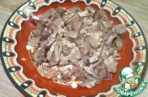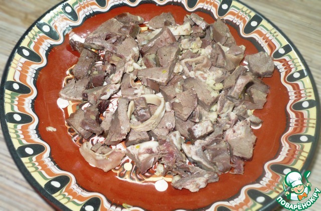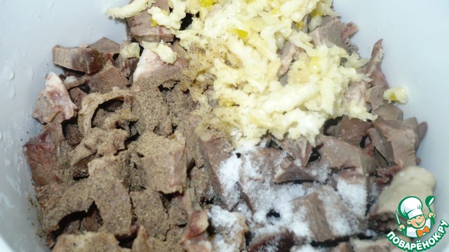 В миску с нарезанным сердцем добавить раздавленный через пресс чеснок, подсолить и поперчить по вкусу. Количество чеснока тоже можно варьировать по своему вкусу.