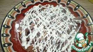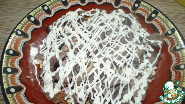 Сверху сеточку майонеза. Можно упростить задачу и сердце сразу смешать с майонезом.