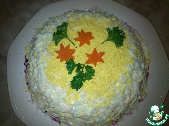 6 слой - белок варёного яйца натереть на крупной тёрке, большую часть по бокам. Затем на мелкой тёрке натереть желток - больше в центре. Украсить сверху петрушкой, и можно вырезать цветочки из овощей. Всё готово. Приятного аппетита!