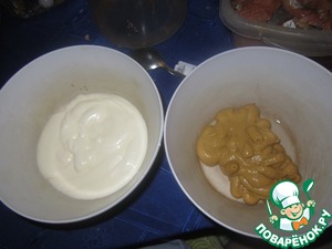 Берем 2 чашки, в одну выдавливаем майонез, в другую горчицу. Я брала продукты на глаз.