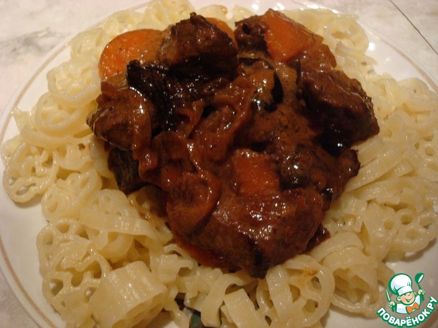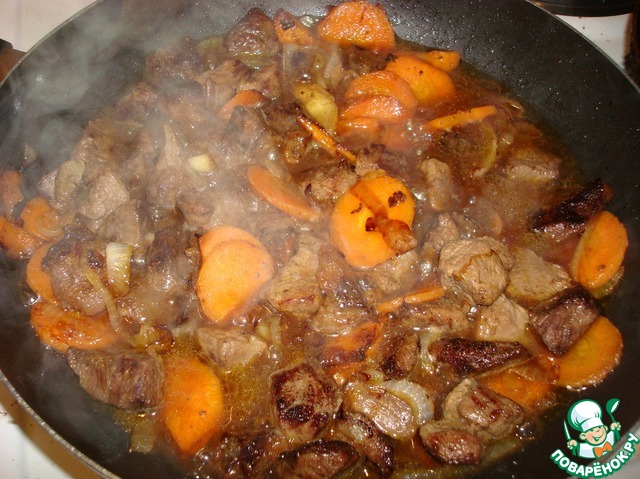 2/3 процеженного кофе влить в сковороду с мясом и овощами и тушить 10 минут под крышкой