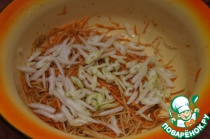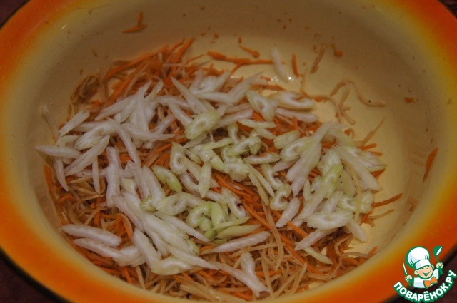 Редьку очистить и натереть на корейской терке, отжать от лишнего сока.