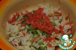 Так же, на корейской терке, натереть морковь, добавить к редьке.