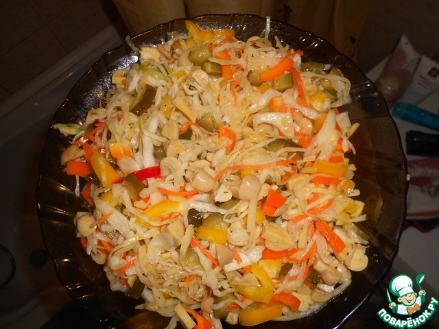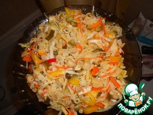 Добавляем капусту, пропускаем чеснок через пресс, тщательно перемешиваем.
