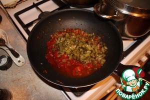 В сковороде разогреваем оливковое масло и обжариваем до золотистого цвета мелко порезанный лук. Добавляем томатную пасту.
