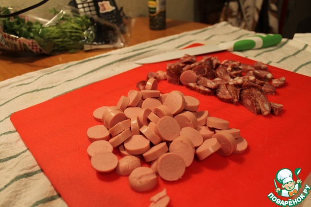 Сосиски режем кружочками, краковскую колбасу - брусочками.