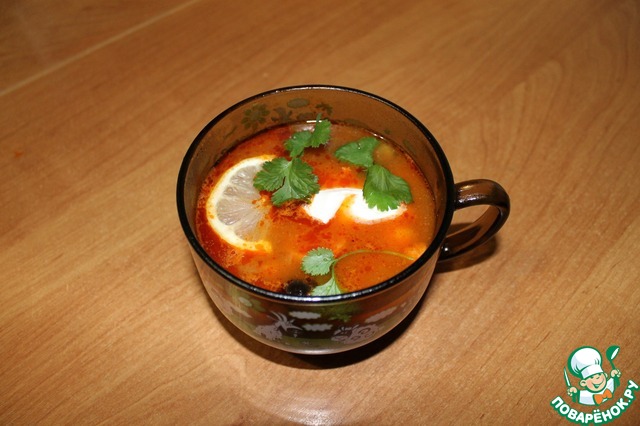 Разливаем солянку по супницам, добавляем ломтик свежего лимона.