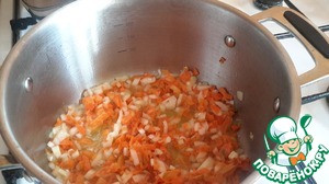 В кастрюлю наливаем щедро растительное масло, нагреваем и обжариваем лук и морковь.