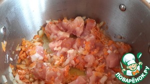Потом добавляем филе и обжариваем еще несколько минут, чтобы всё позолотилось.