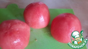 Пока филе варится, готовим помидоры. На пару минут опускаем их в кипяток, вынимаем чистим от кожицы.
