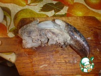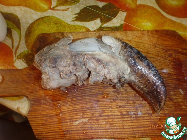 Отвариваем свиной язык. У меня он весом 550 грамм. Варим 1 час. В принципе можно взять и такое-же количество говяжьего языка. Разница только в том, что свиной более жирный. |