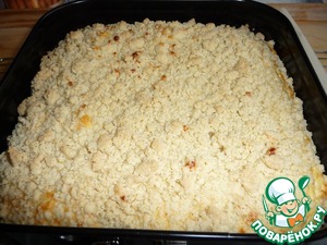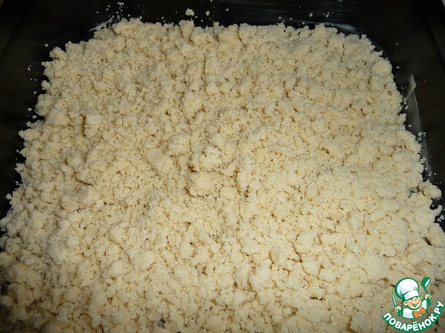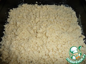 Форму (у меня 24 х 24) смазать маслом, застелить пекарской бумагой. Выложить 1/2 часть мучной крошки.