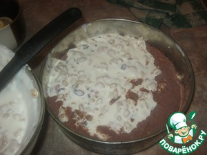Выкладываем в разъемную форму слоями-часть массы, посыпать шоколадом (тёртым), снова слой массы-у меня вышло три слоя и две прослойки