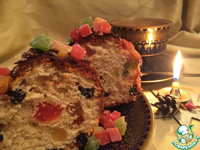 [+5]делала всё по рецепту,правда цукаты были: из папаи,киви , ананаса,апельсиновых корочек,абрикосов и имбиря.ещё к изюму добавила сушоную чернику и клюкву.
