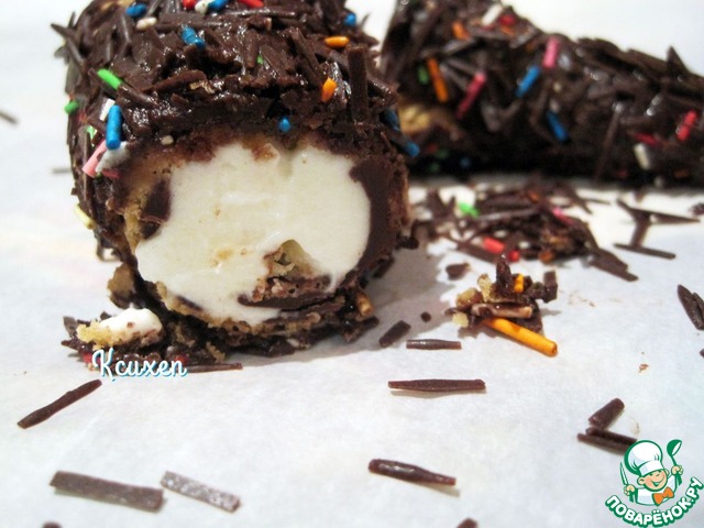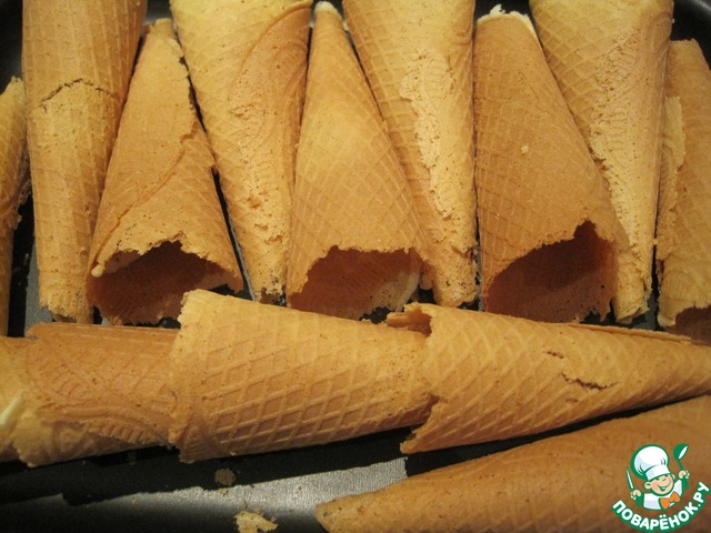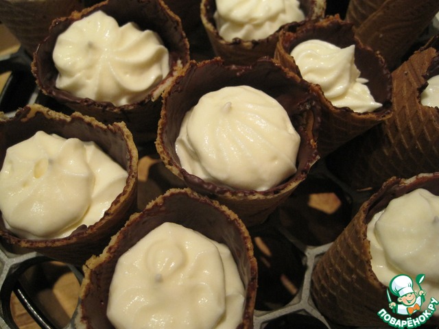 Для наполнения: взобъём сливки до устойчивой пены, продолжая взбивать, добавим маскарпоне, растопленный белый шоколад и пудру. Наполним вафельные рожки сливочным кремом, немного не доходя до края. Растопим на пару оставшиеся 100 грамм горького шоколада. Зальём донышки растопленным горьким шоколадом (этот шаг я забыла сфотографировать в спешке). Установим рожки ровно вертикально ( в стаканах или на решётке для пельменей) и уберём в холодильник до застывания (1-2 часа).
