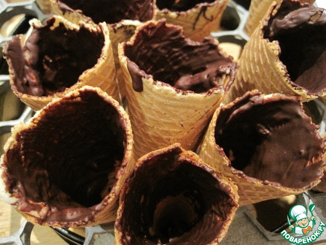 100 грамм шоколада растопим на пару и каждый рожок изнутри покроем шоколадом. Уберём рожки в холодильник до застывания шоколада. Что б рожки стояли вертикально, я использовала решётку для пельменей. Можно установить рожки в стаканы.