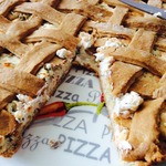 Заполнить тесто начинкой. Вторую часть теста так же раскатать, нарезать полосками и выложить поверх начинки.