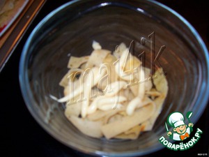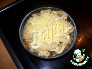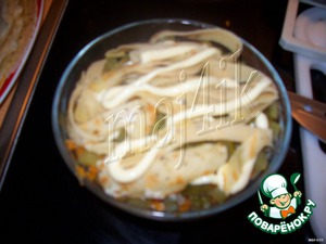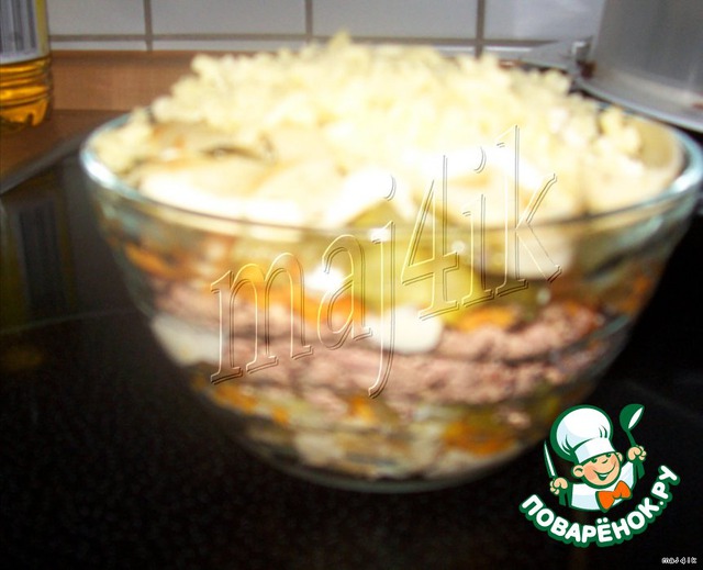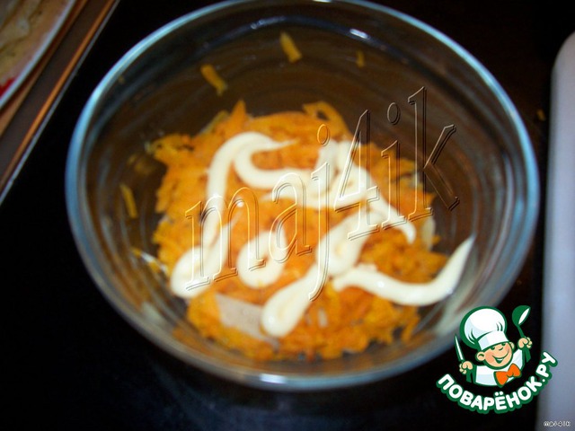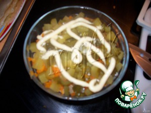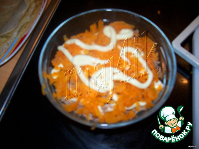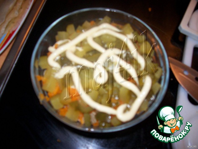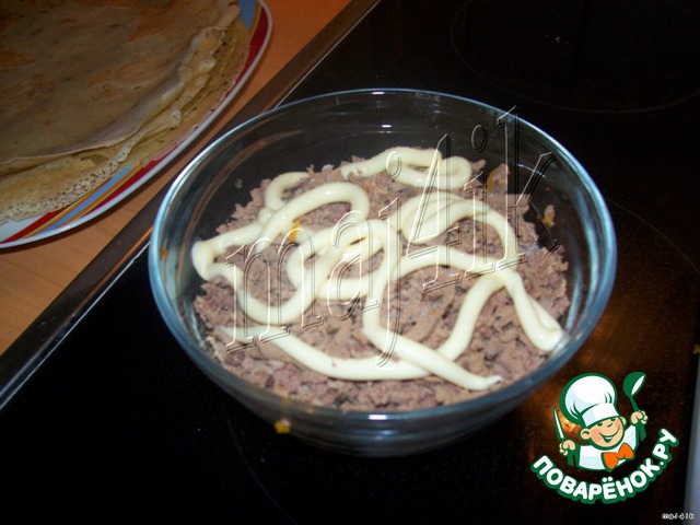 Блинчики нерезать полосками, положить на дно и добавить немного майонеза