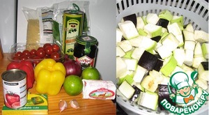 Заранее надо подготовить баклажаны и цуккини. Нарезав их кусочками где то по 2.5 см, перемешайте с чайной ложкой соли и поставьте под пресс в дуршлаге.