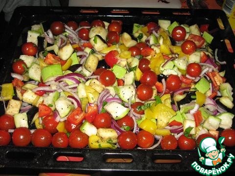 В большой миске перемешиваем баклажаны, цуккини, помидорки, нарезанные квадратиками по 2.5 см лук и сладкий перец, базилик. Добавляем 3 столовые ложки оливкового масла, раздавливаем чеснок, посыпаем солью-перцем и еще раз перемешиваем, чтобы овощи были равномерно покрыты маслом.