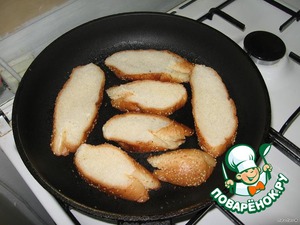 Белый хлеб нарезать ломтиками и обжарить с одной стороны на